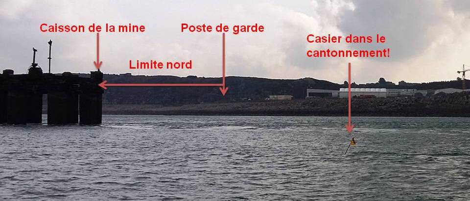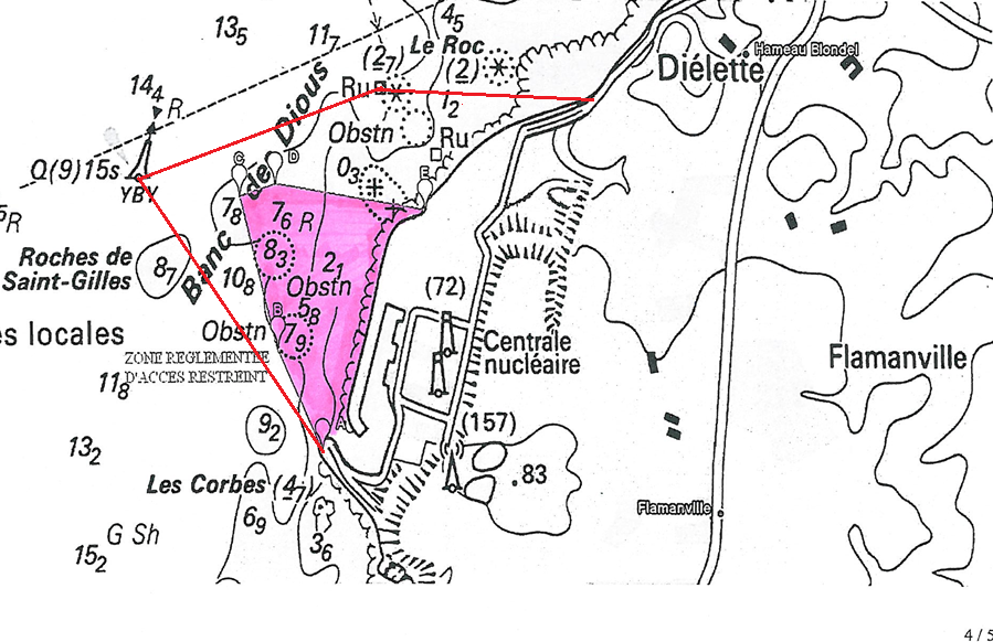 - Limite NW : caisson (marque détruit sur la carte) / bouée cardinale ouest 49°32’63 N